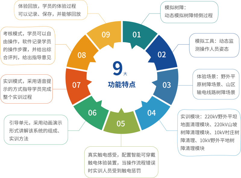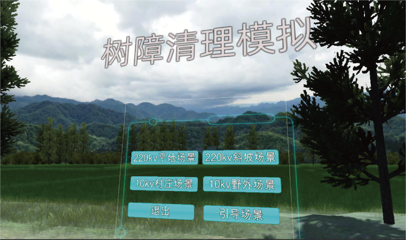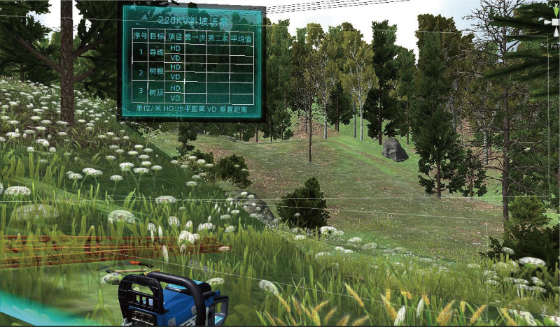 本项目在虚拟场景中搭建输电线路环境,按照真实作业流程模拟树障清理的整个过程,通过采用VR 互动技术 为参训人员提供沉浸式的作业训练环境;模拟开展真实的树障清理工作,对实训人员的操作情况进行监视、 记录,通过画面警示、声音报警、文字提示、触觉感知等形式,对操作行为给予实时的反馈与警示。